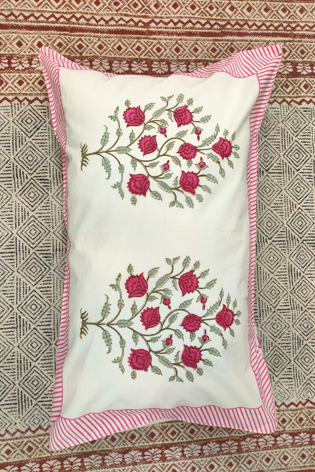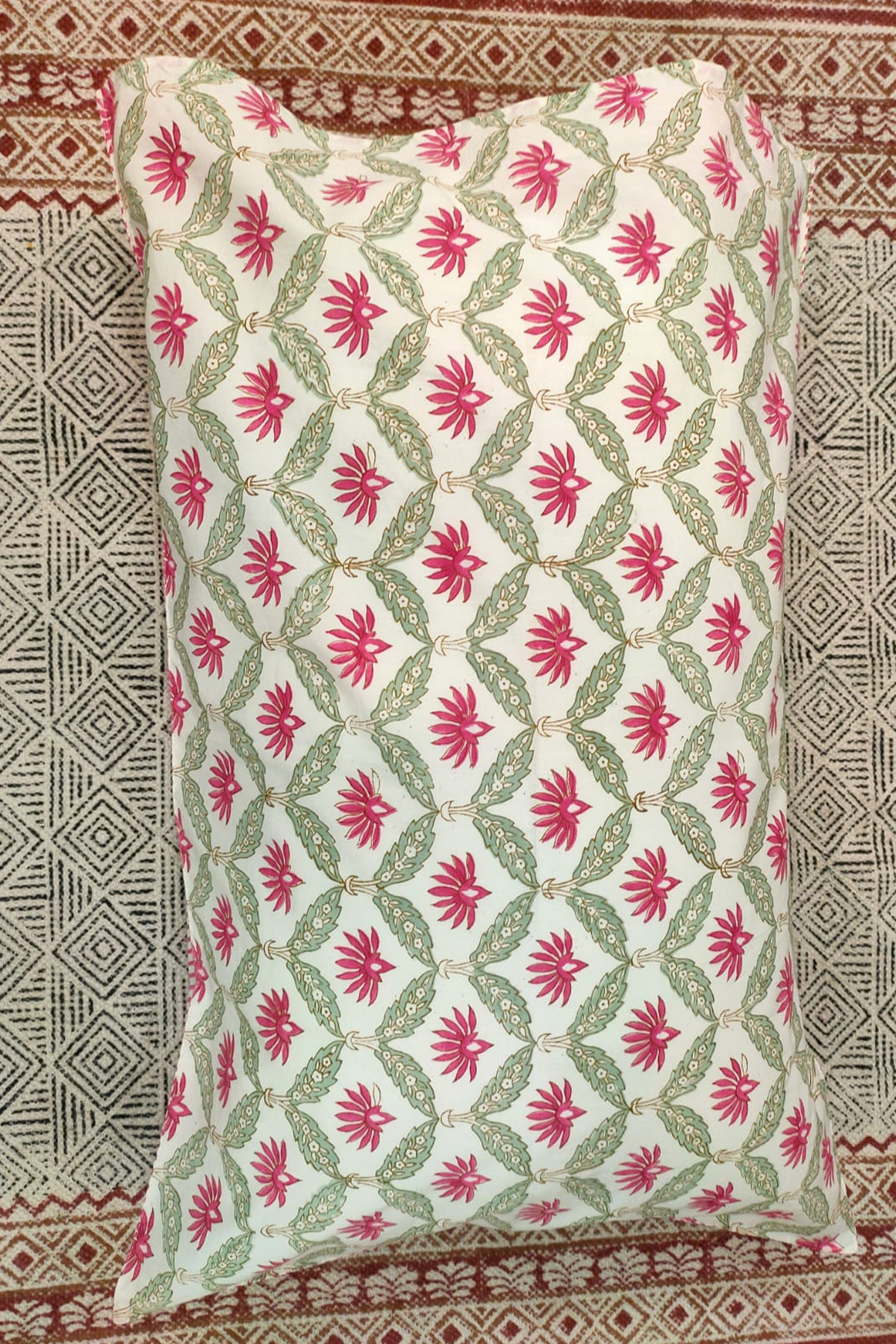The intricate hand block print detailing adds a refined artisanal charm, while the crisp white base enhances the luxurious and sophisticated appeal of your space. The fabric drapes beautifully, giving your bed a polished, hotel-inspired finish.