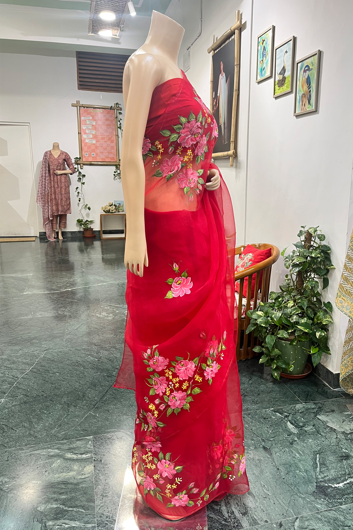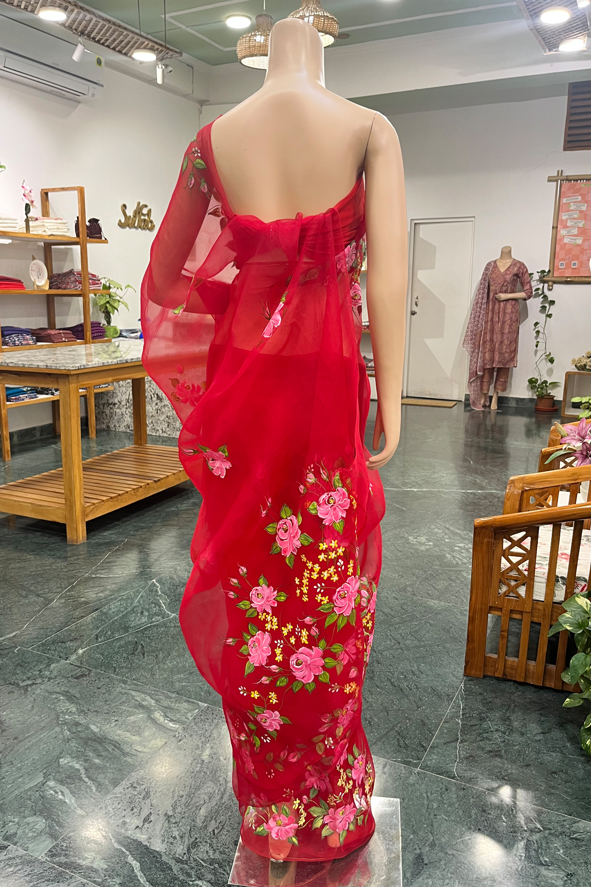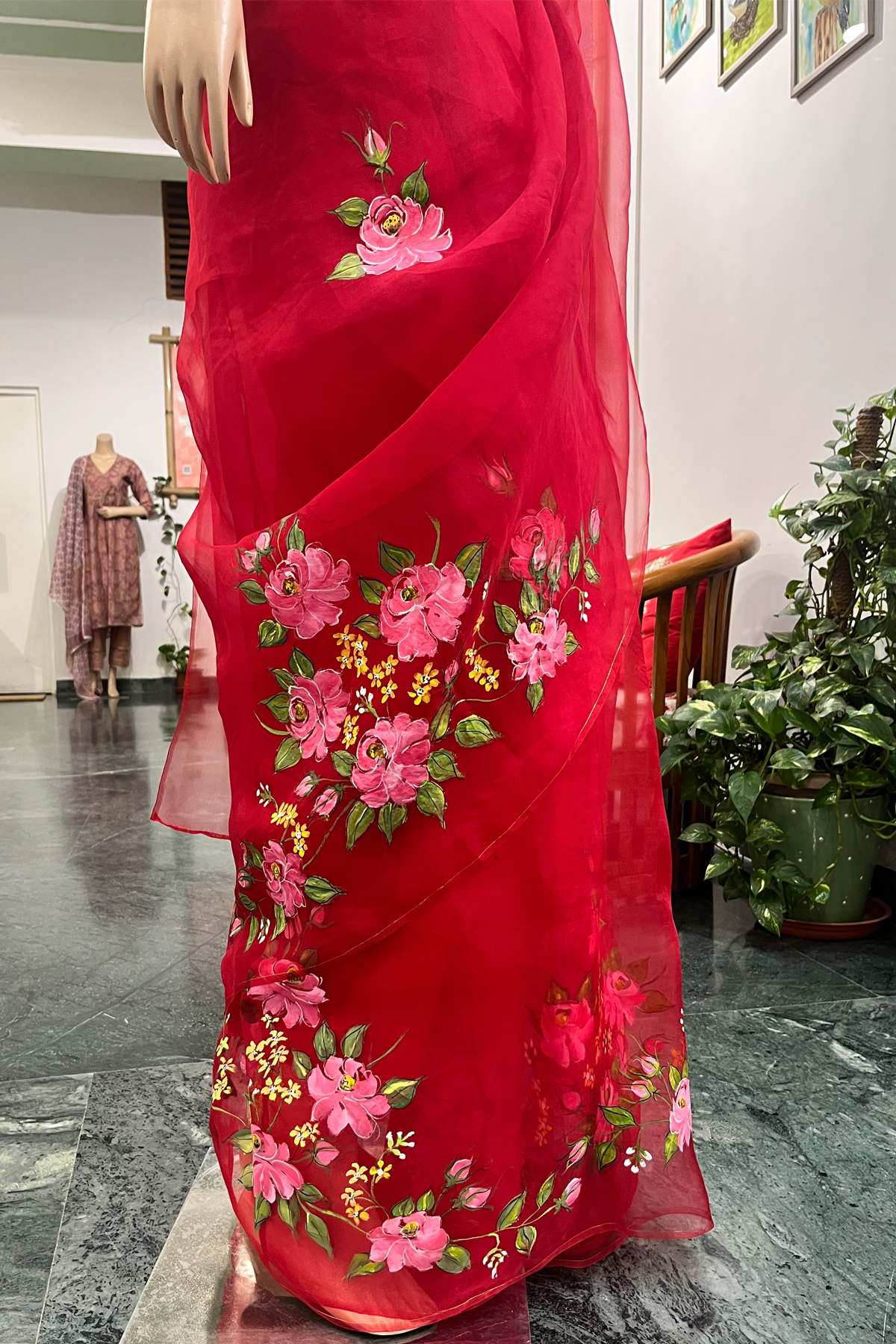 • Pair with a solid silk or organza blouse to let the hand-painted work stand out