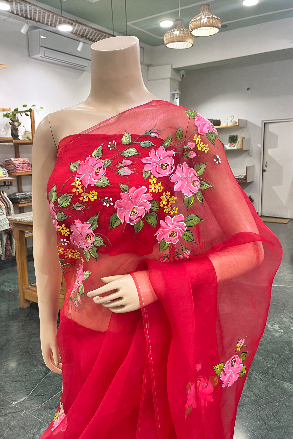 The lightweight, sheer organza drapes beautifully, while fine hand-brush painting and thoughtful detailing add a refined festive touch without overpowering the artistry. Graceful, artistic, and timeless, this saree is crafted to adorn you with effortless sophistication and individuality.
