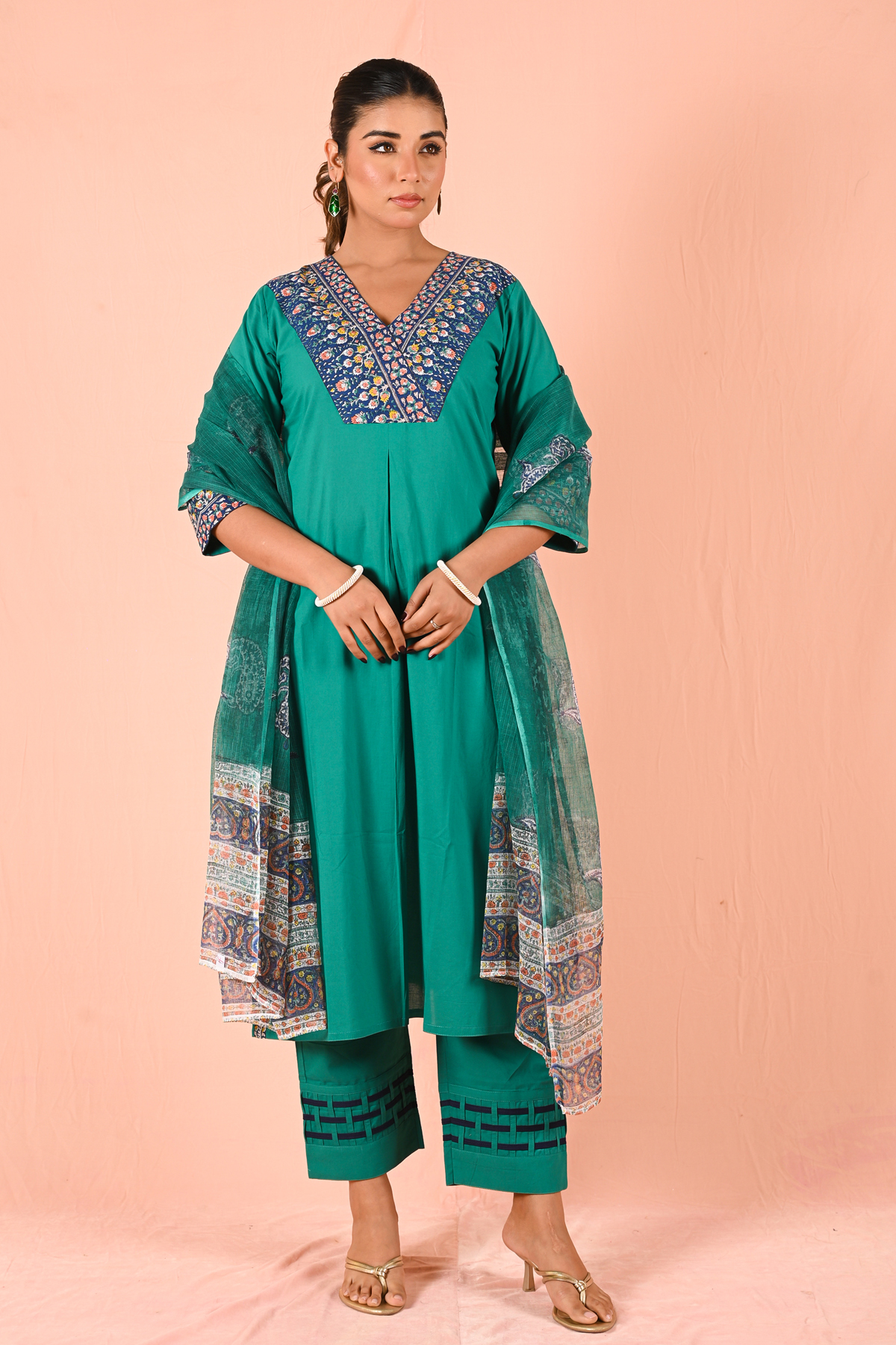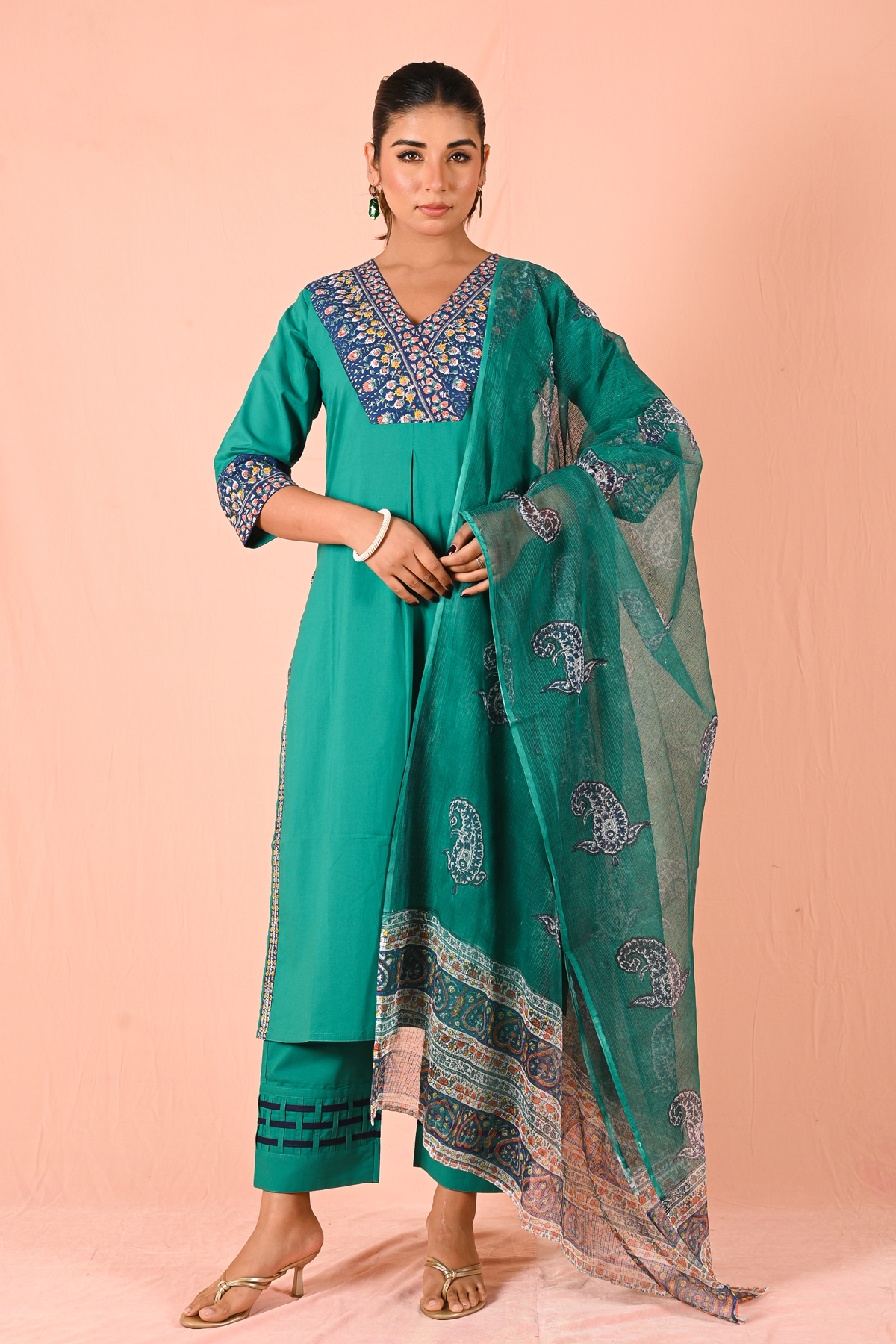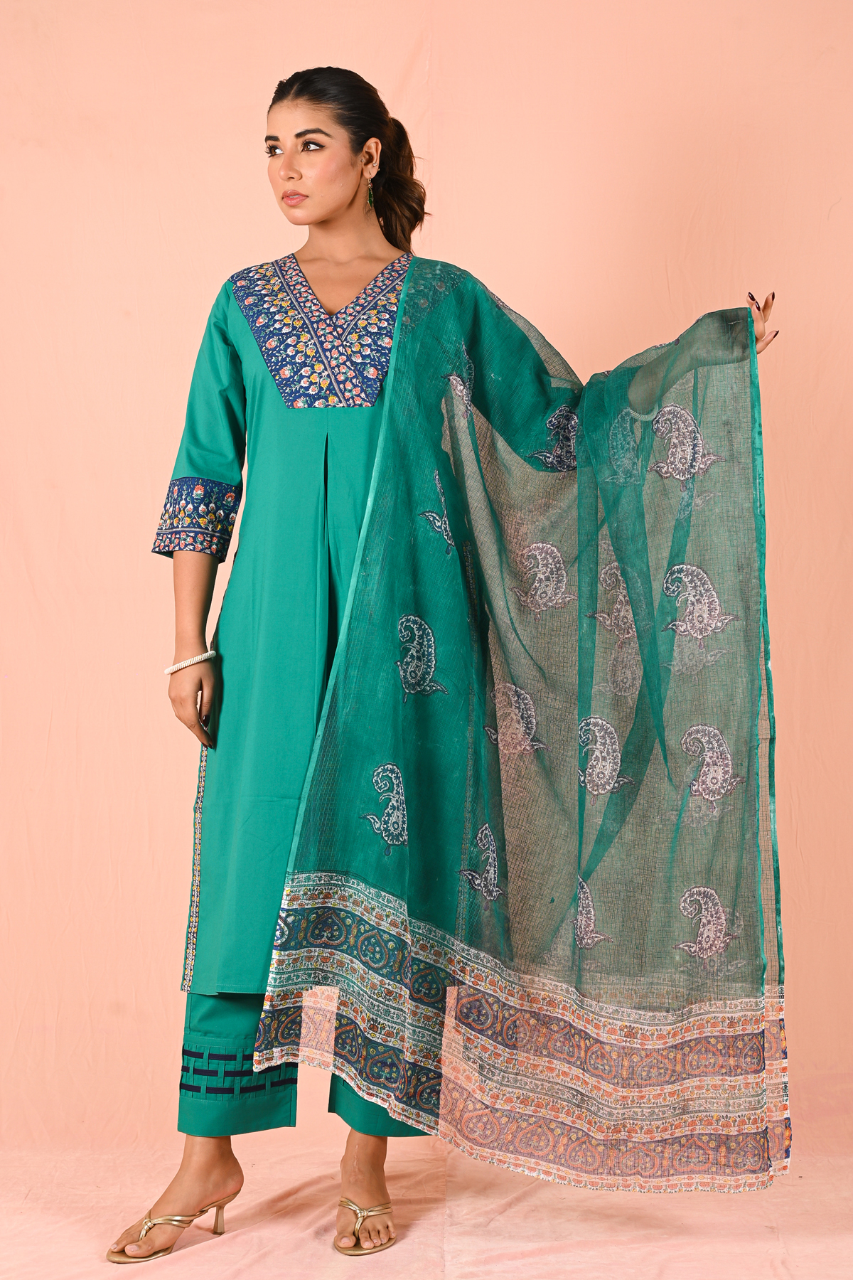 The highlight of the set is the Kota Doria dupatta—lightweight, sheer, and adorned with delicate paisley prints and an intricately designed border. It adds movement, texture, and a graceful finish to the entire outfit.