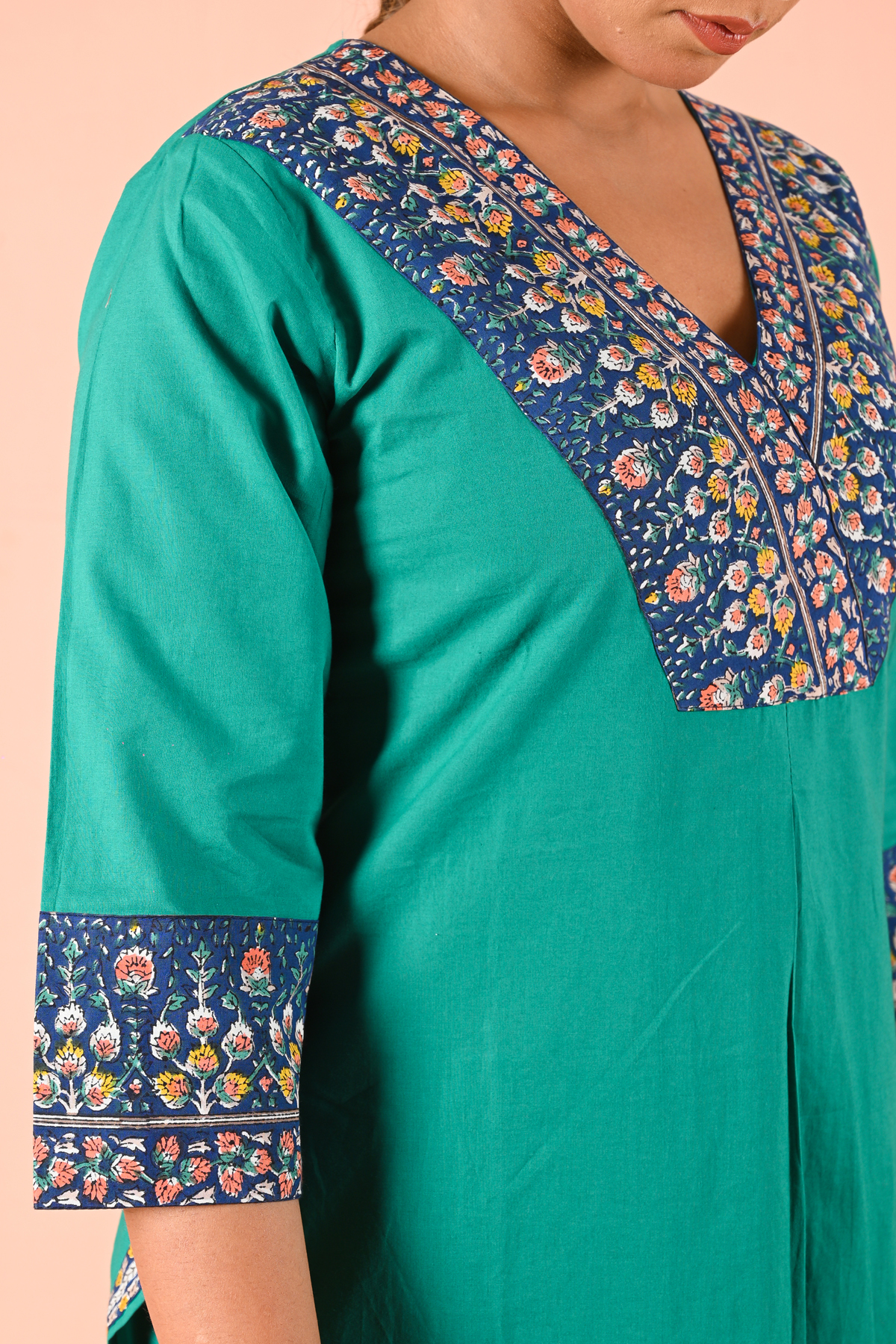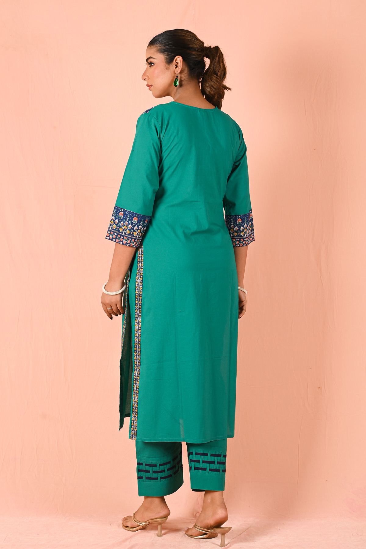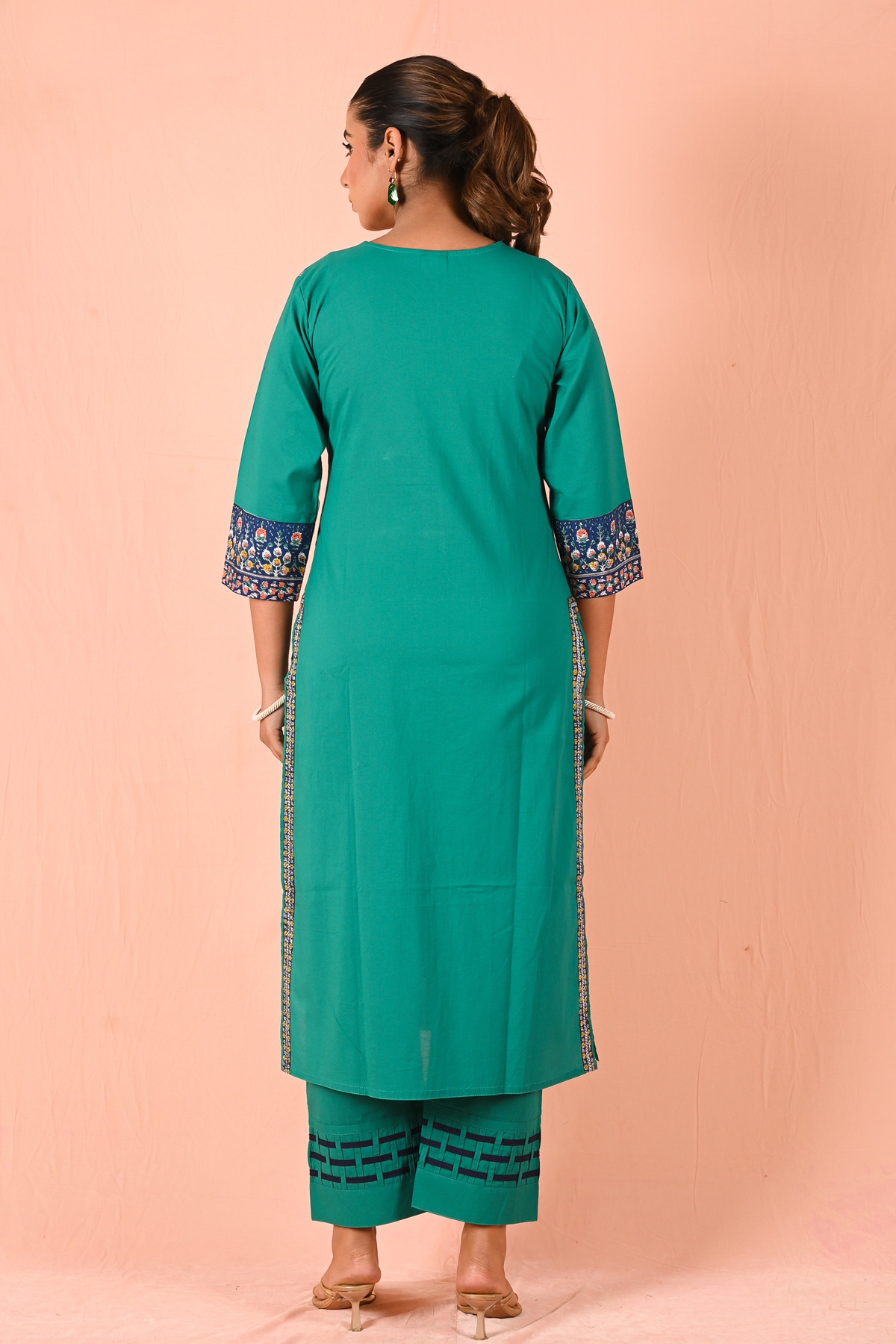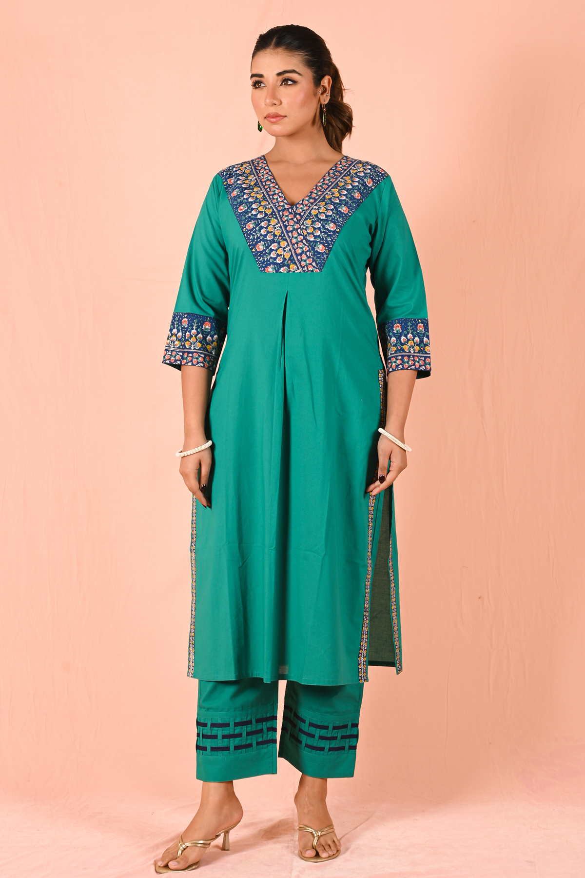 The straight-cut kurta is elevated with an intricately detailed printed neckline panel, bringing a refined contrast to the solid base. The sleeves carry subtle print accents, maintaining harmony in design. Paired with structured straight pants featuring minimal geometric detailing at the hem, the look stays clean yet distinctive.