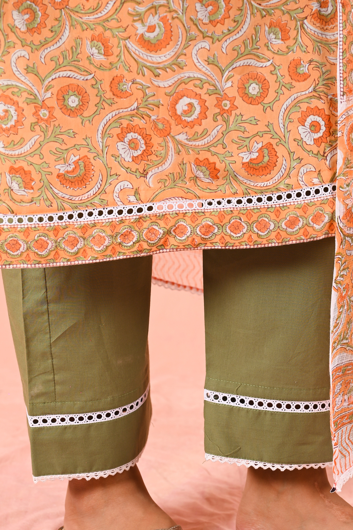 Inspired by the warmth of blooming marigolds, this elegant kurta set brings together tradition and refined artistry. Crafted in a soft orange palette, the kurta features intricate hand-inspired floral prints with delicate detailing on the neckline and borders.