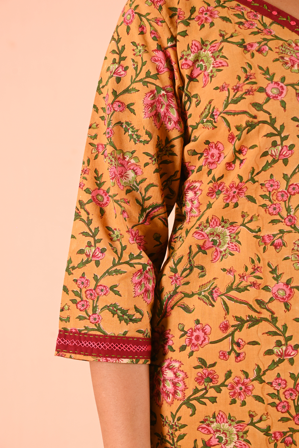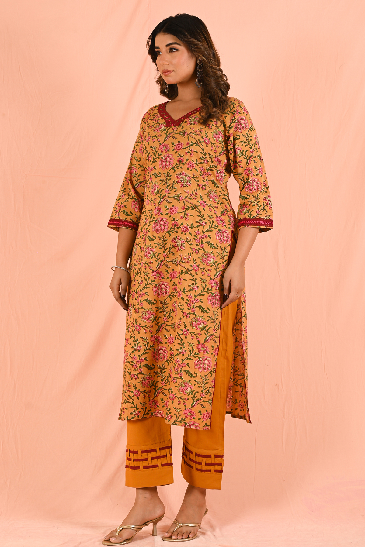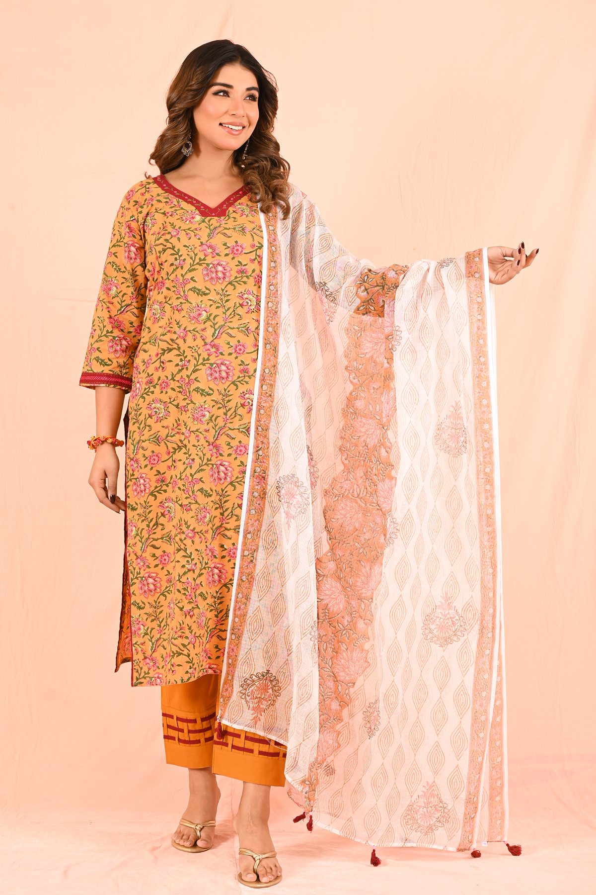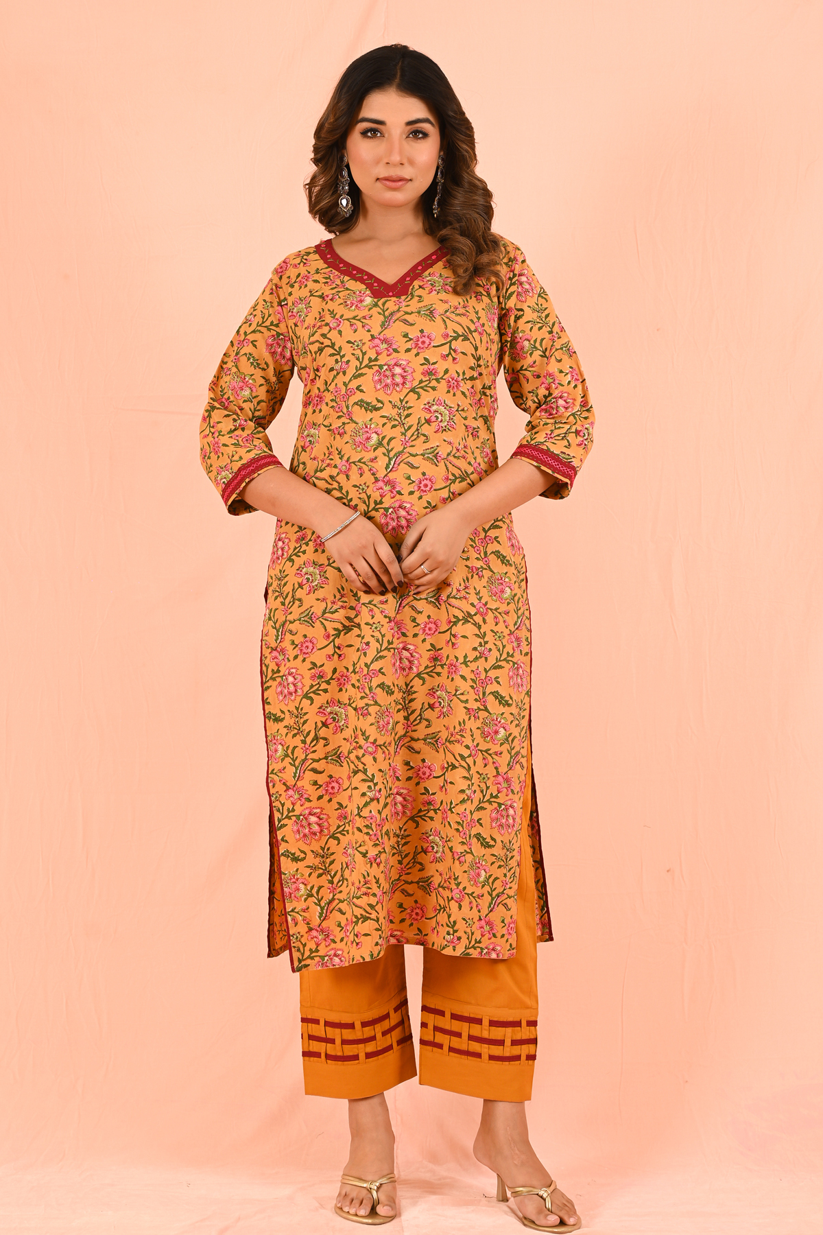 A glow that speaks of richness — the Golden Aura set is crafted in a striking yellow tone that instantly uplifts your presence. The vibrancy of the color is beautifully balanced with deep dark red accents, creating a look that feels bold yet refined.