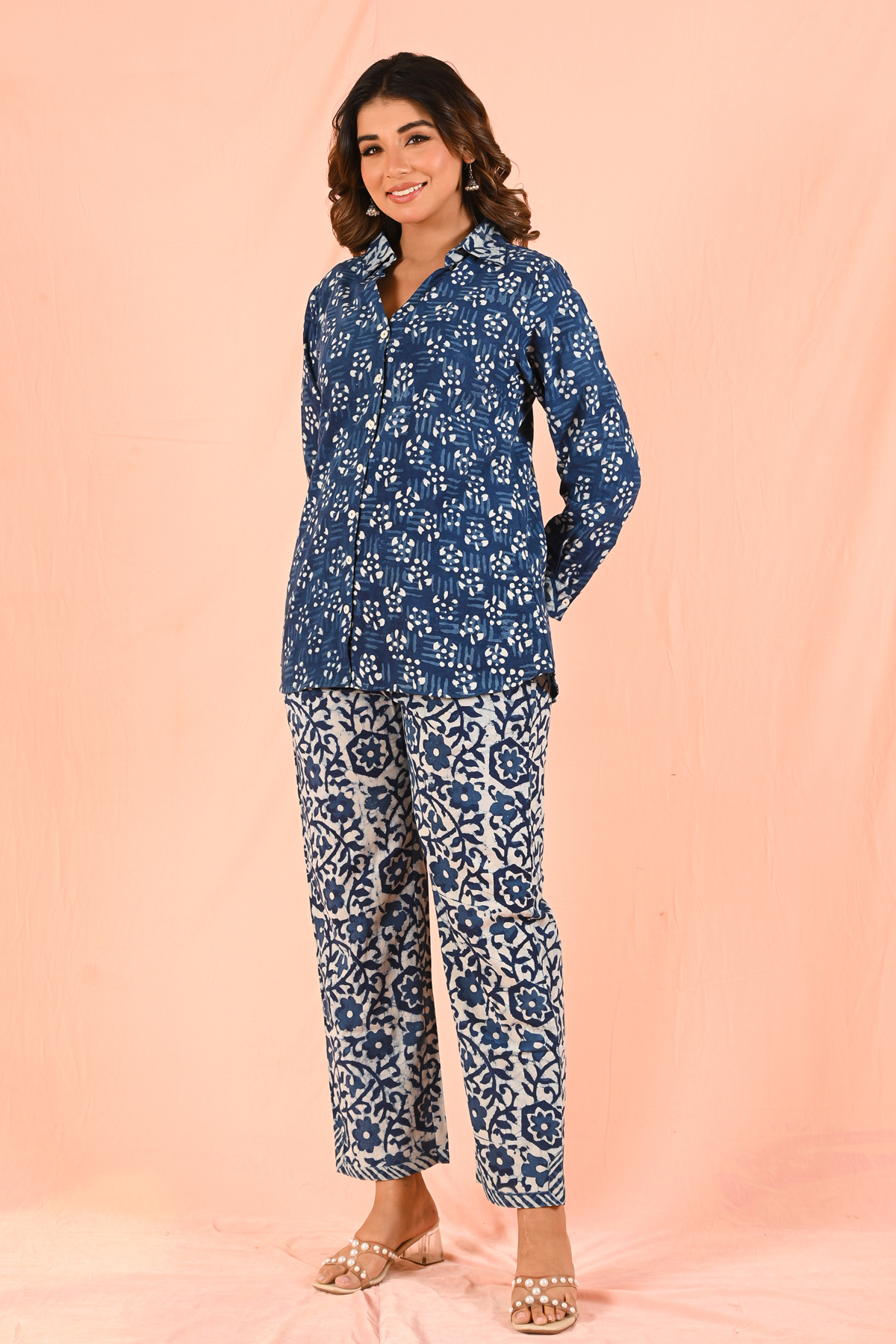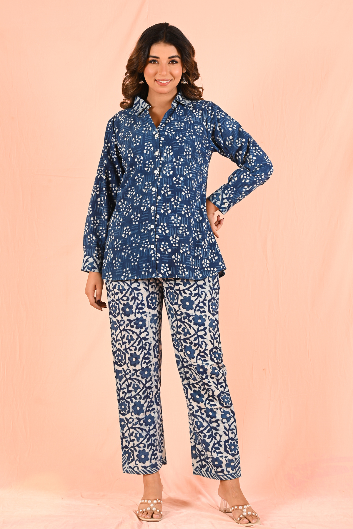 Pair this indigo shirt with off-white or beige trousers for a clean and classic look. It also works perfectly with denim or relaxed cotton pants for an easy everyday style. Roll up the sleeves and add simple accessories for a relaxed yet refined appearance.
