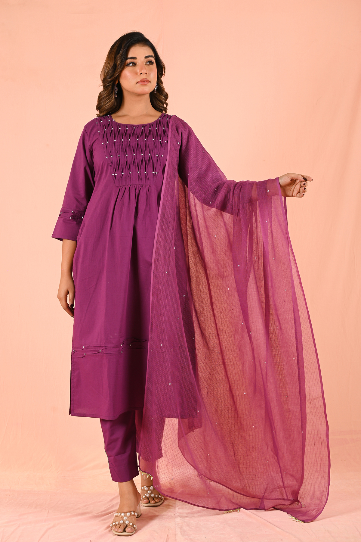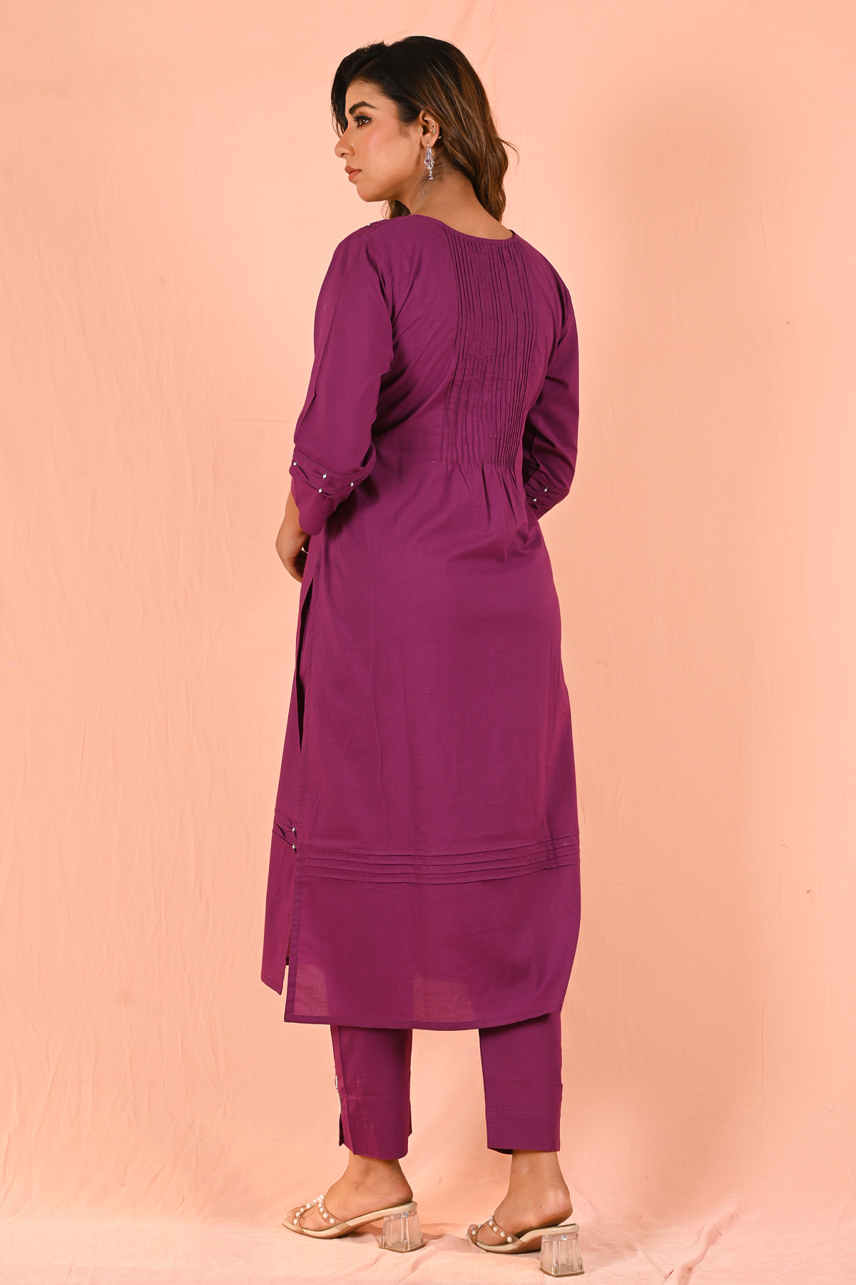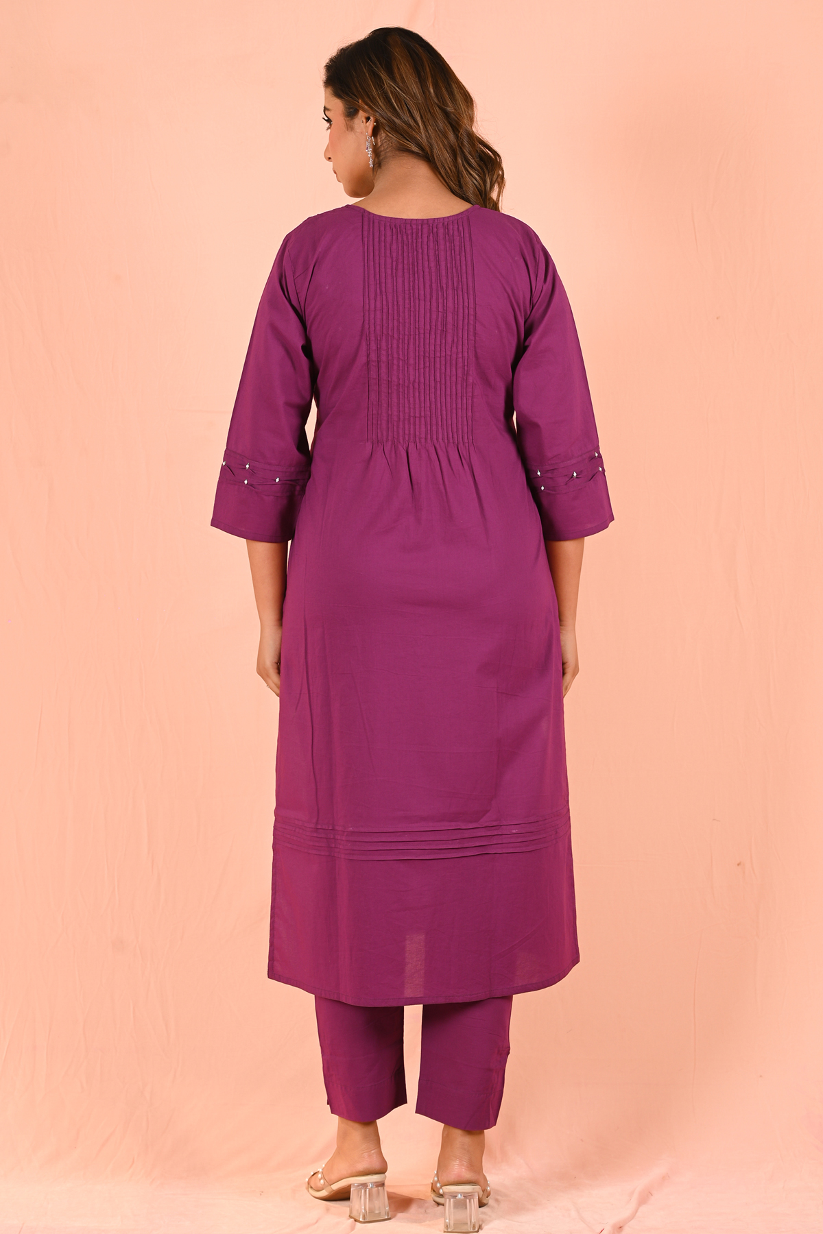 Style it with statement earrings or classic pearls for an elevated look. Pair with heels or embellished juttis for a polished finish. Keep makeup soft with a bold lip to enhance the rich purple tone, or go all minimal for a sophisticated vibe.