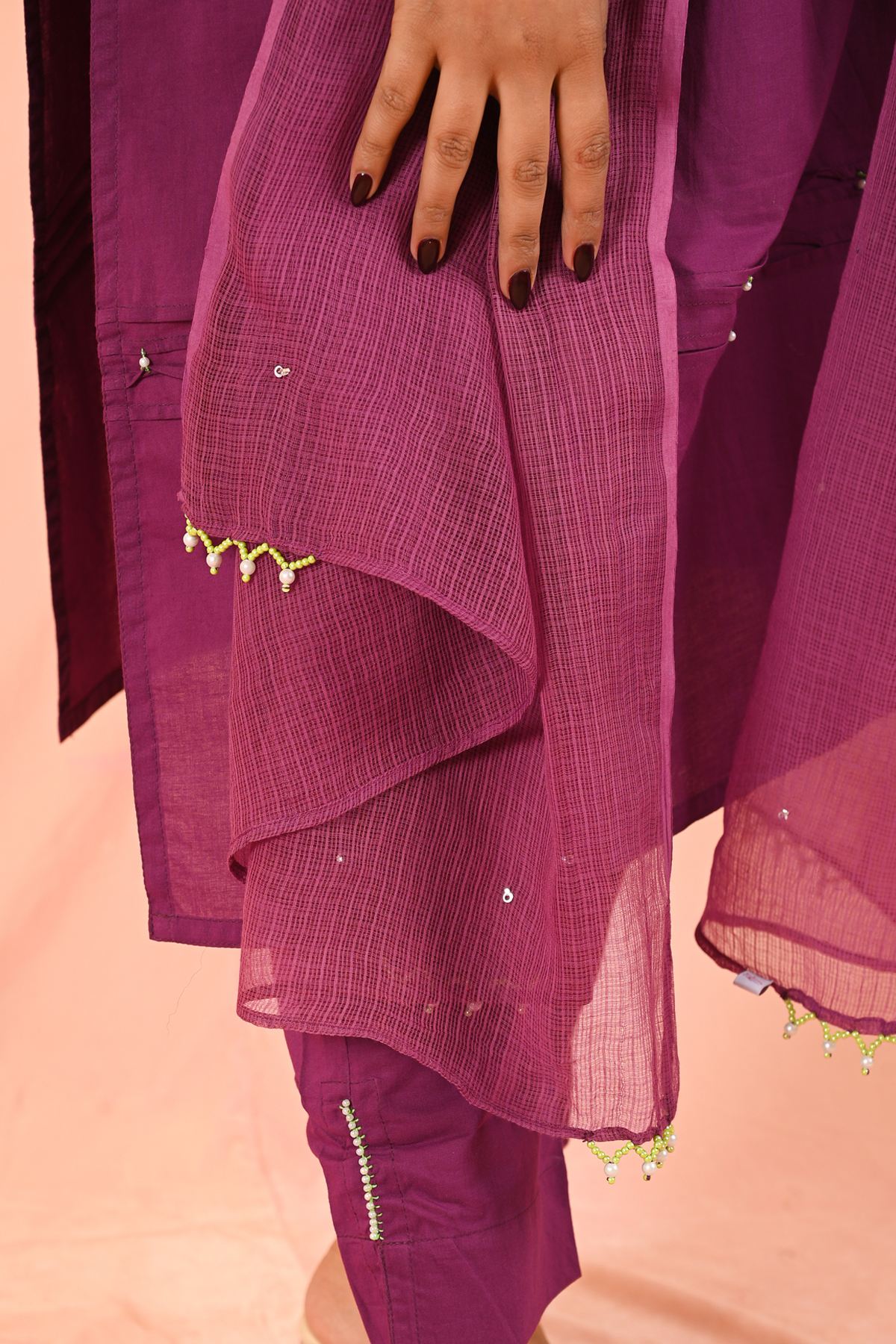 A refined expression of understated luxury, this jamun purple kurta set is crafted in a rich plain base, elevated with delicate pearl handwork on the kurta. Paired with a graceful dupatta adorned with traditional mukaish detailing, the ensemble brings together minimal elegance and timeless craftsmanship. The deep purple hue adds a regal, retro-inspired charm, making it a versatile yet statement piece.