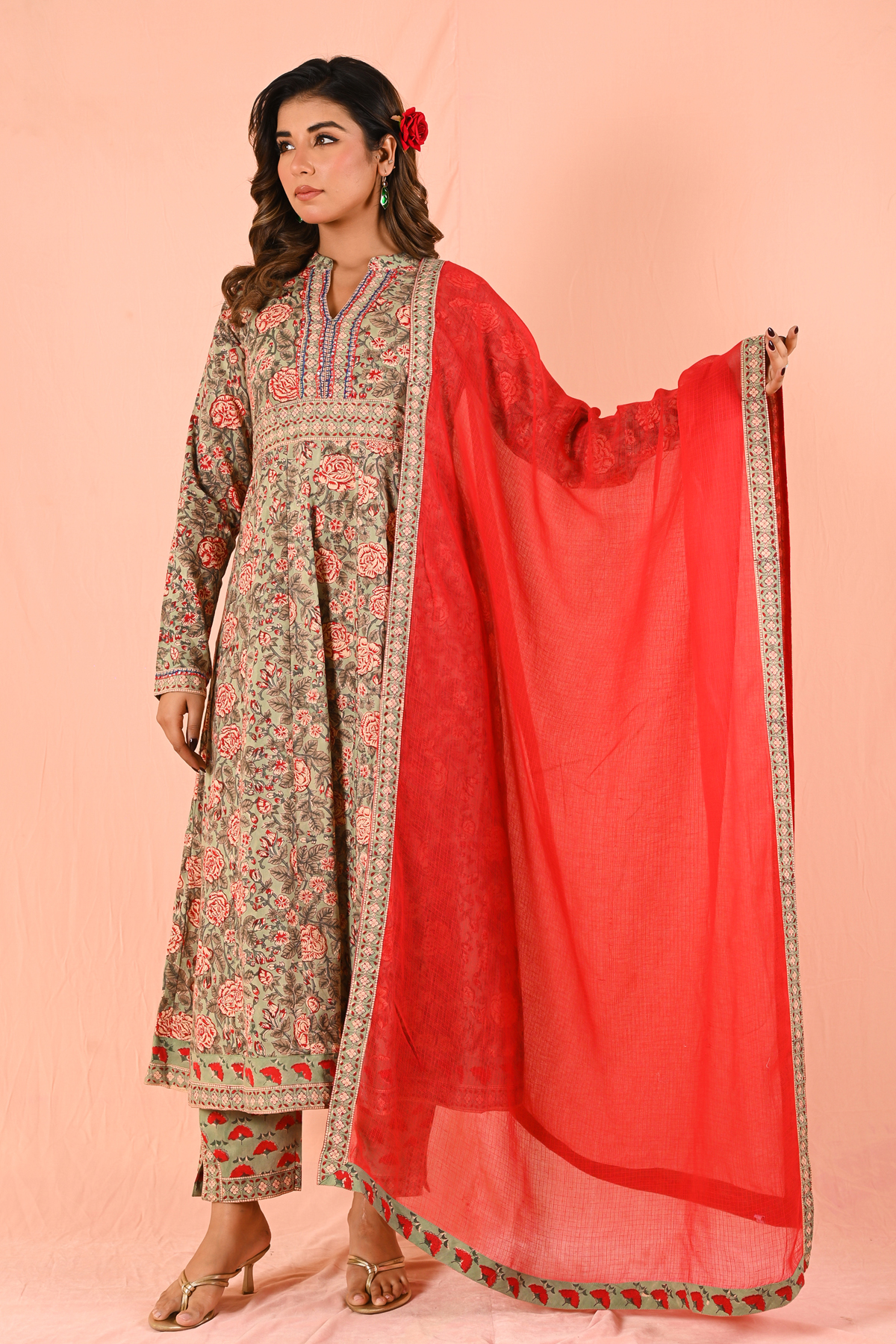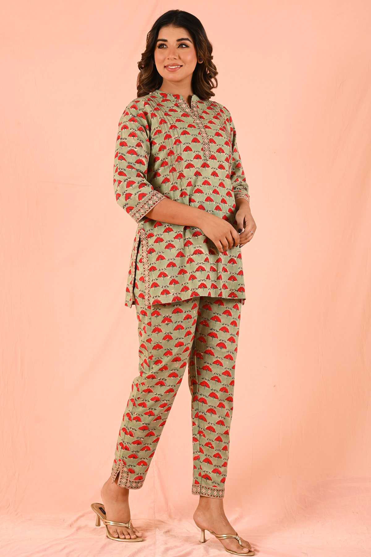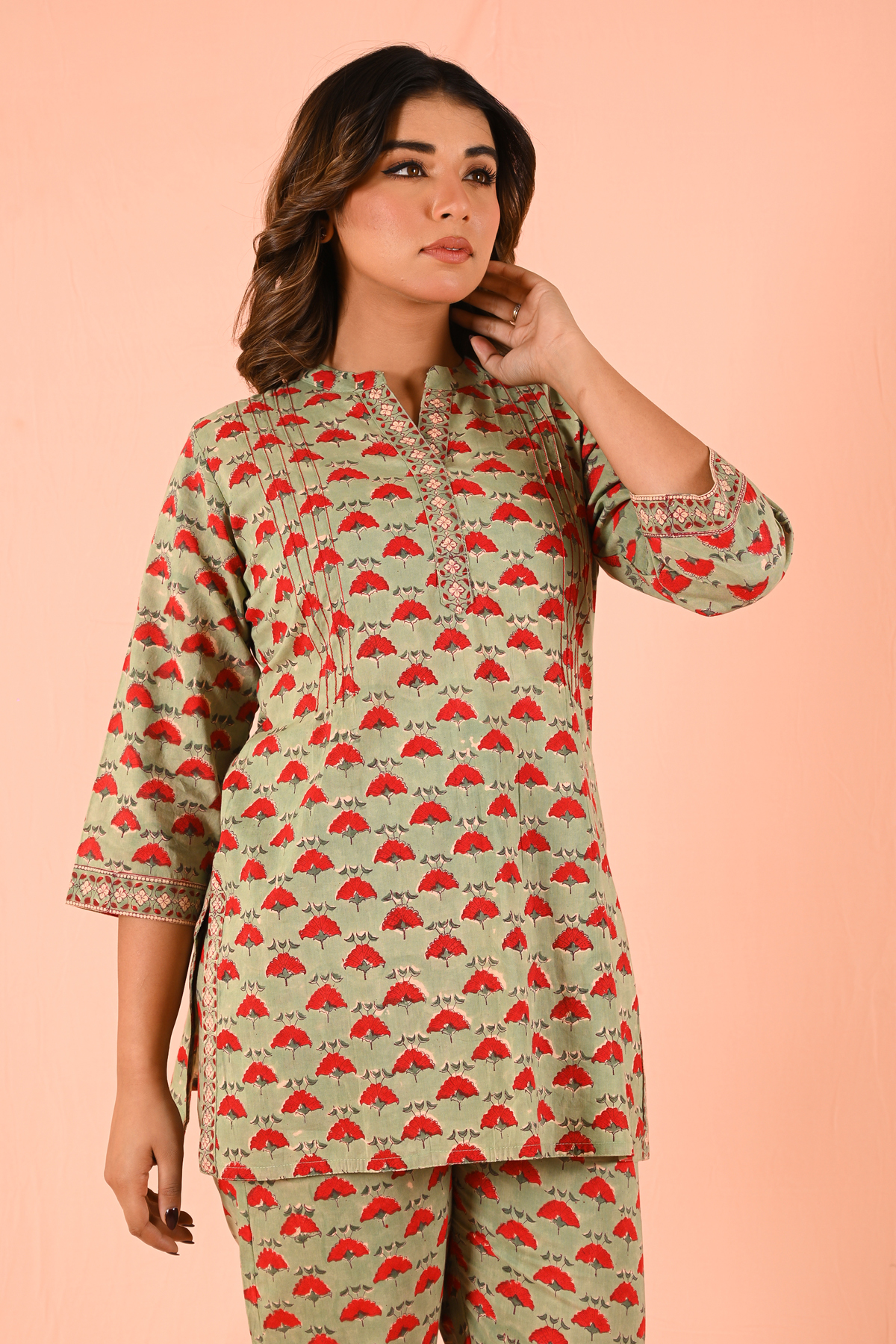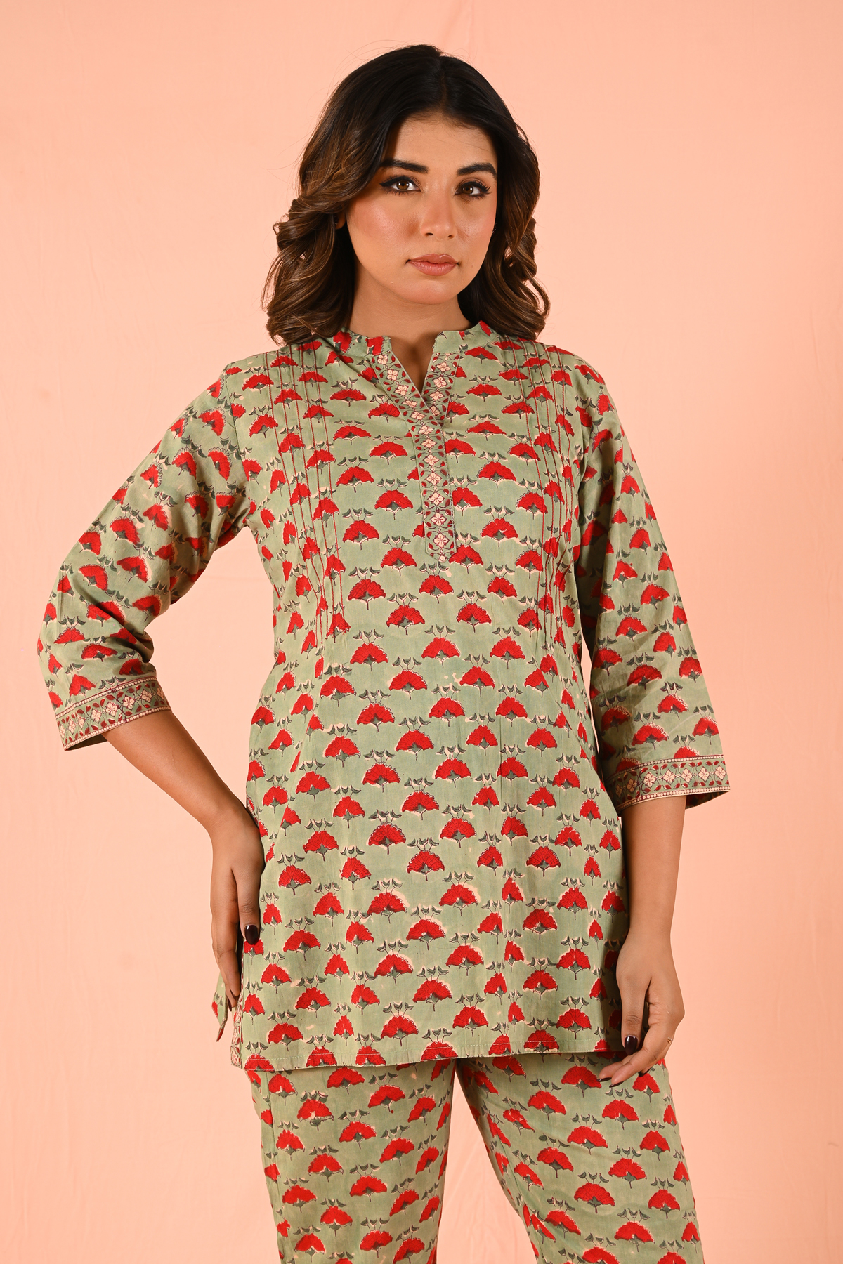 A kurti-tunic length coord set designed for effortless elegance. Crafted in comfortable, breathable fabric, this set is elevated with intricate red thread Kantha handwork, adding a bold artisanal touch to a clean silhouette.