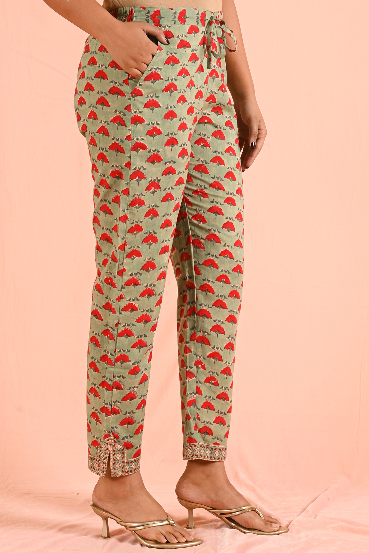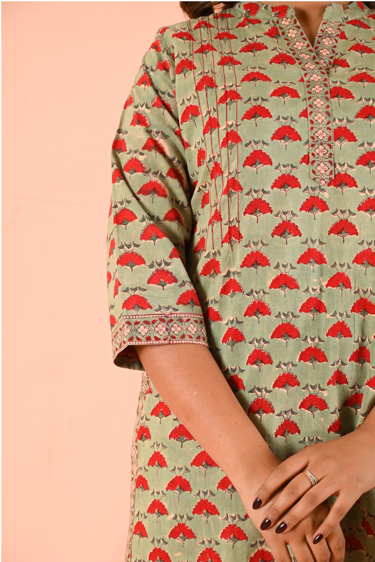 The tunic length kurti pairs seamlessly with coordinated bottoms, making it a versatile ensemble that balances tradition with modern styling. The contrast Kantha detailing uplifts the overall look, making it refined yet wearable for everyday elegance.