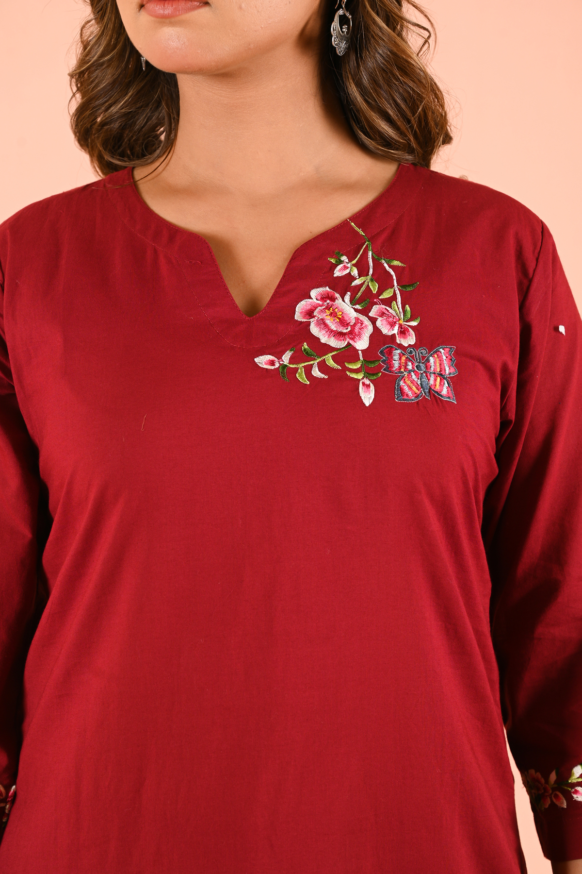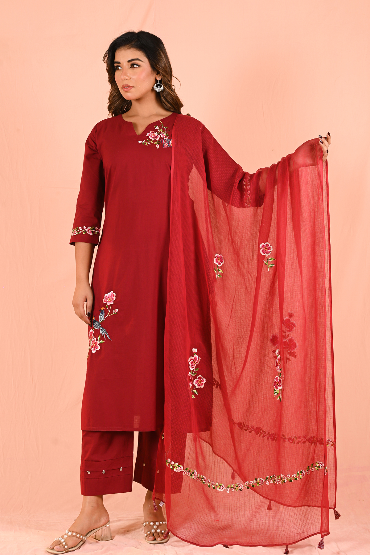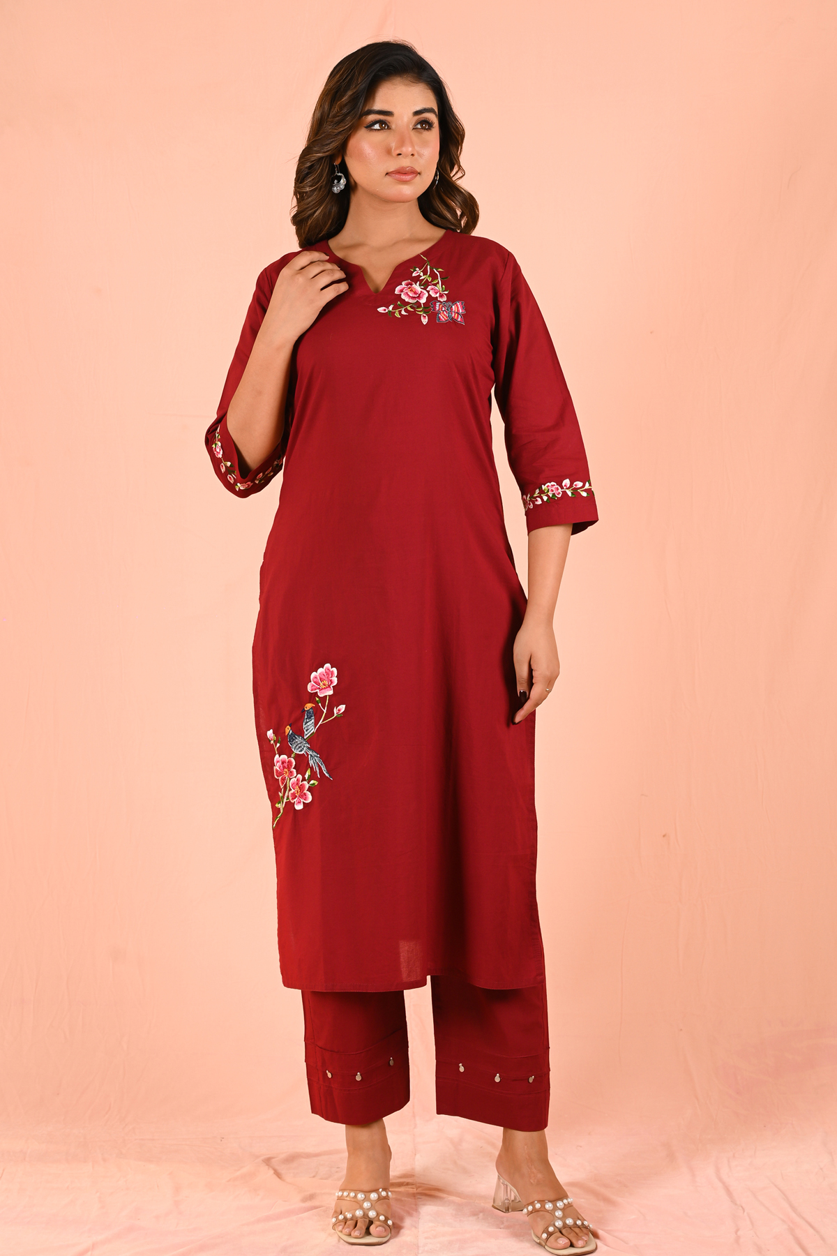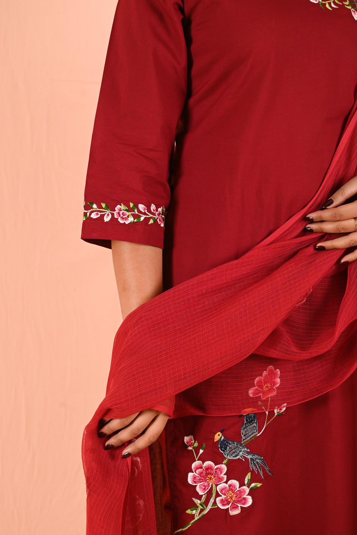 Bold yet graceful, the Lipstick Red kurta set celebrates nature through mindful embroidery of delicate butterflies and a charming couple of birds. The striking lipstick red hue adds confidence and timeless appeal, while the embroidery brings softness and artistry to the silhouette.