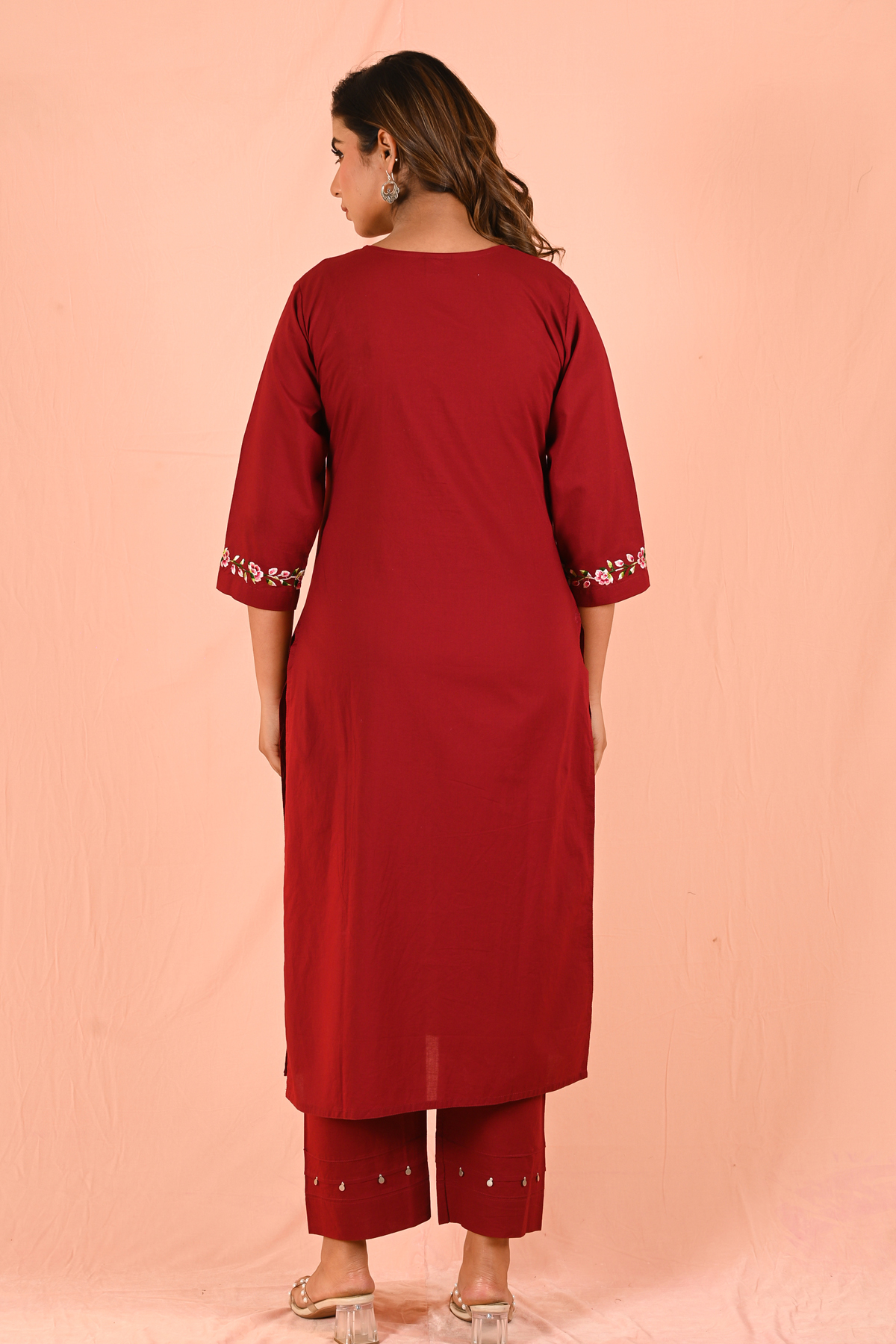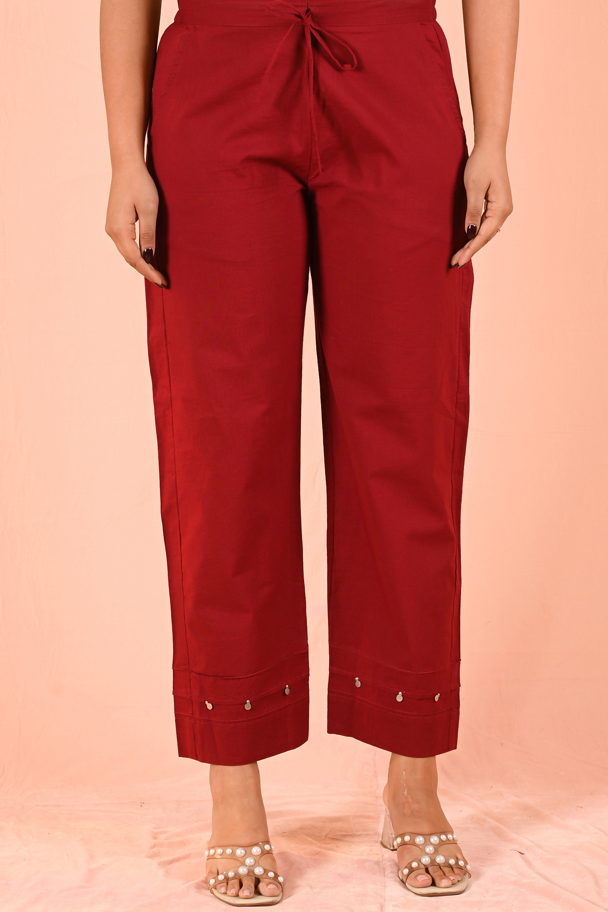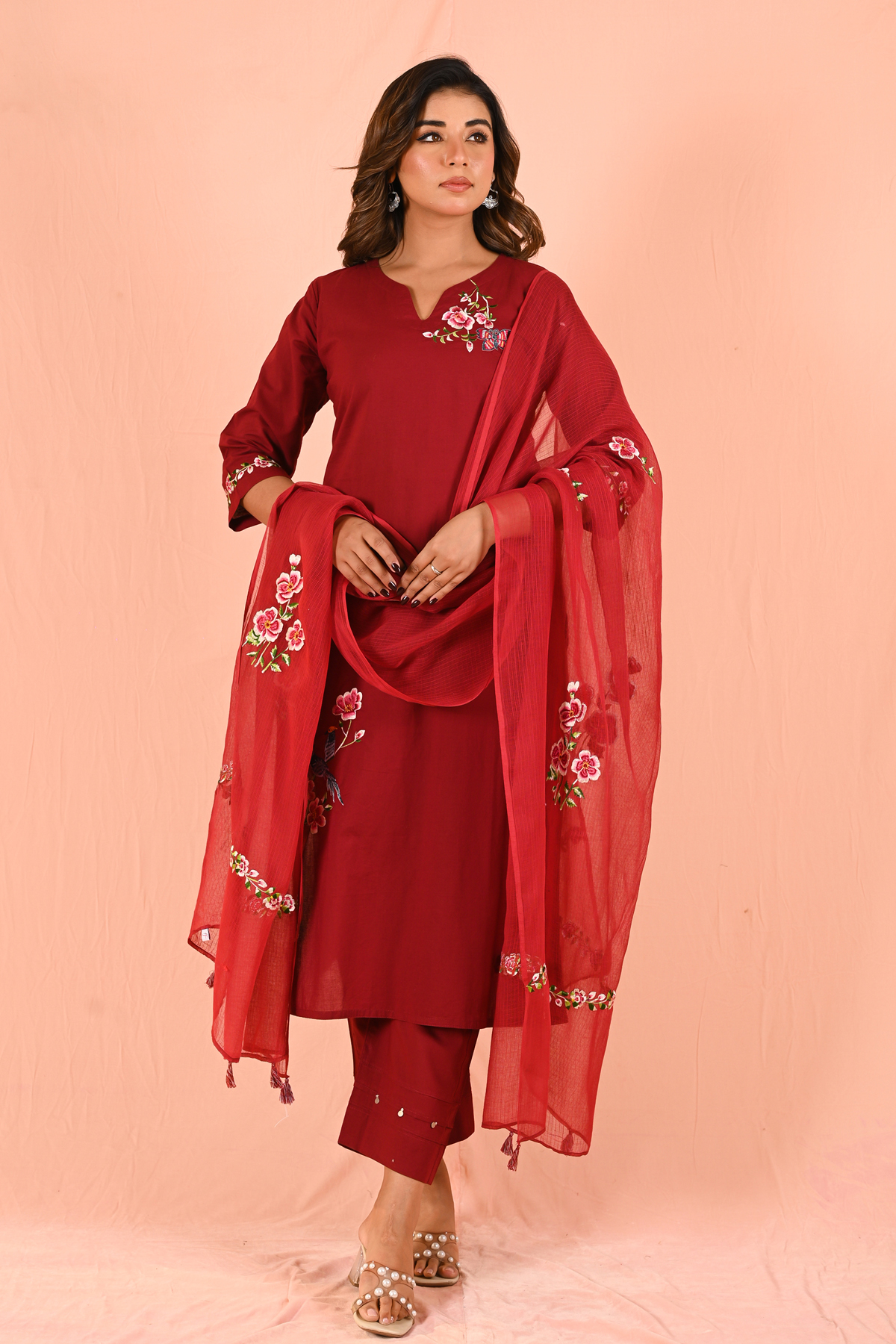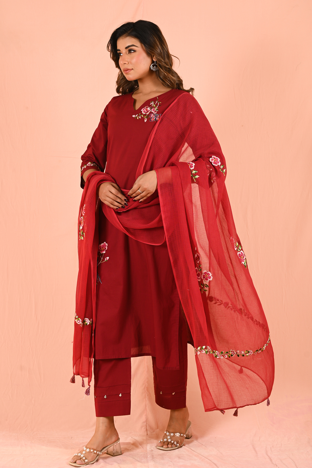 Let the rich red shade stand out by styling with minimal gold or pearl accessories. Pair with classic heels or embroidered flats for a refined finish.