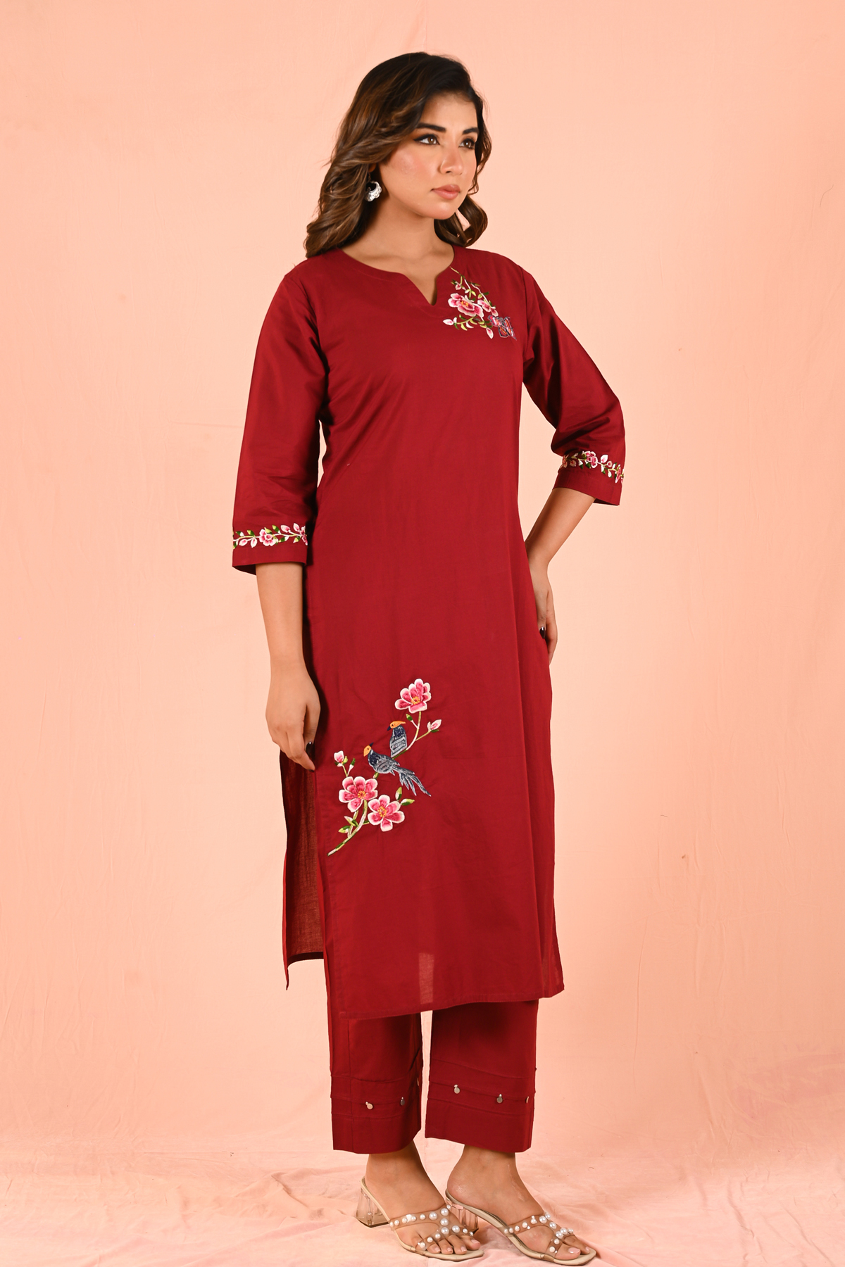 Bold yet graceful, the Lipstick Red kurta set celebrates nature through mindful embroidery of delicate butterflies and a charming couple of birds. The striking lipstick red hue adds confidence and timeless appeal, while the embroidery brings softness and artistry to the silhouette.