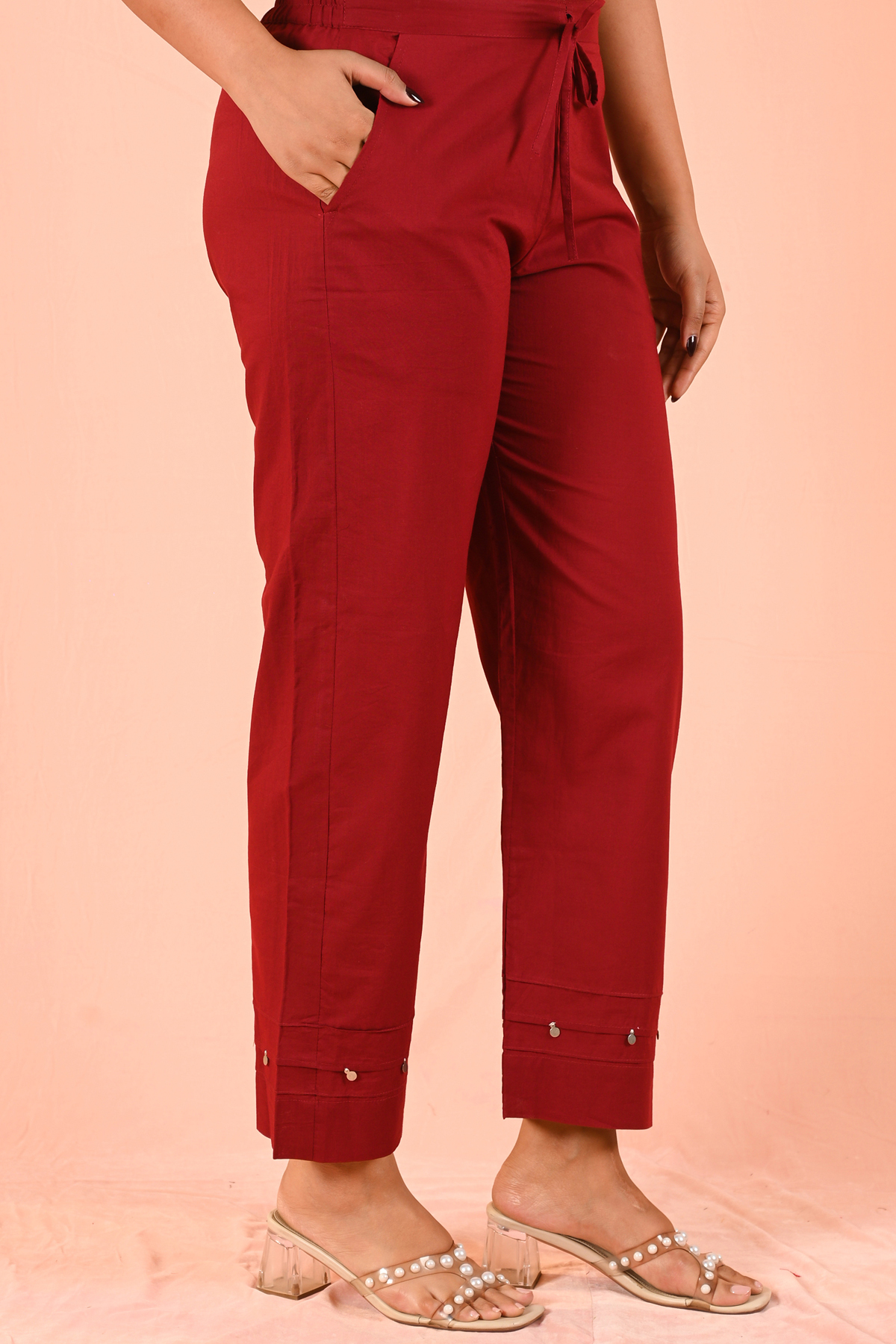 Let the rich red shade stand out by styling with minimal gold or pearl accessories. Pair with classic heels or embroidered flats for a refined finish.