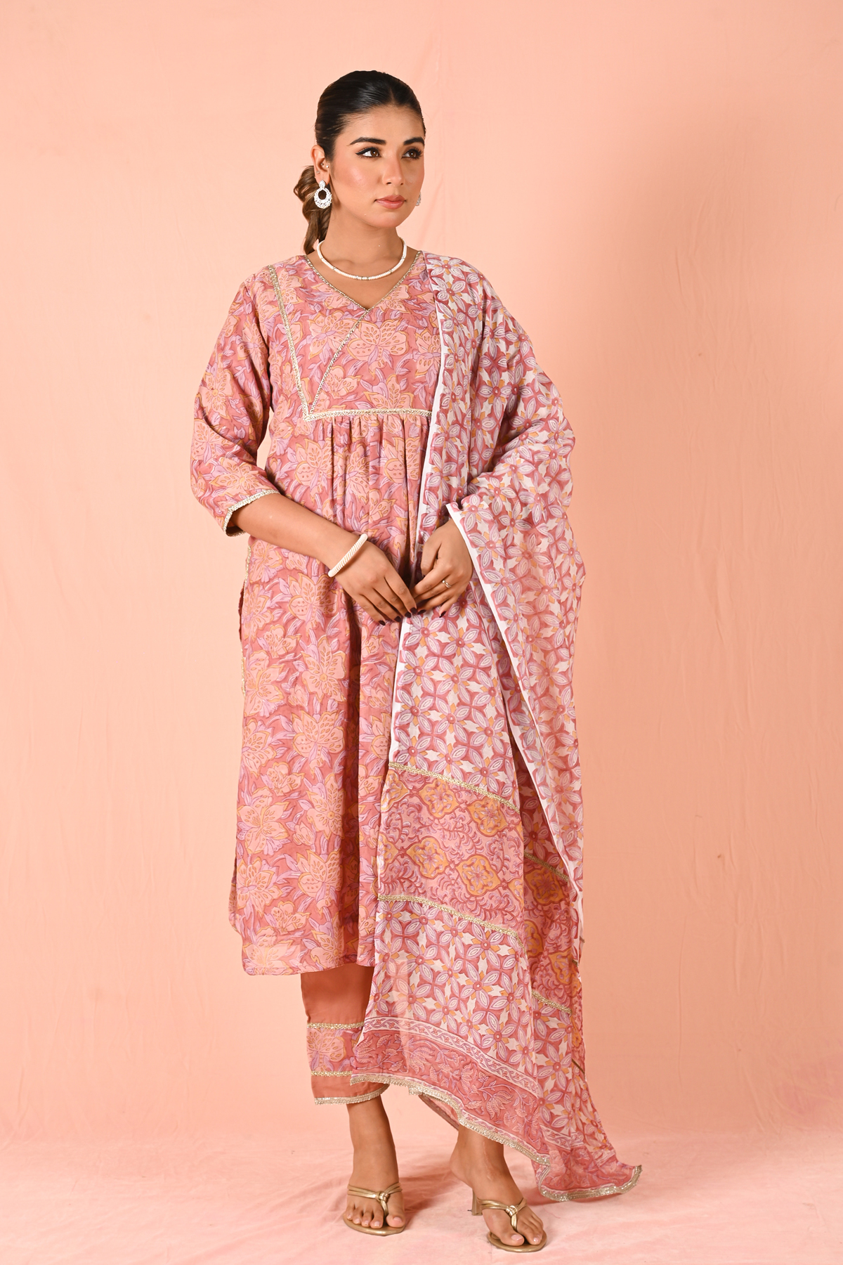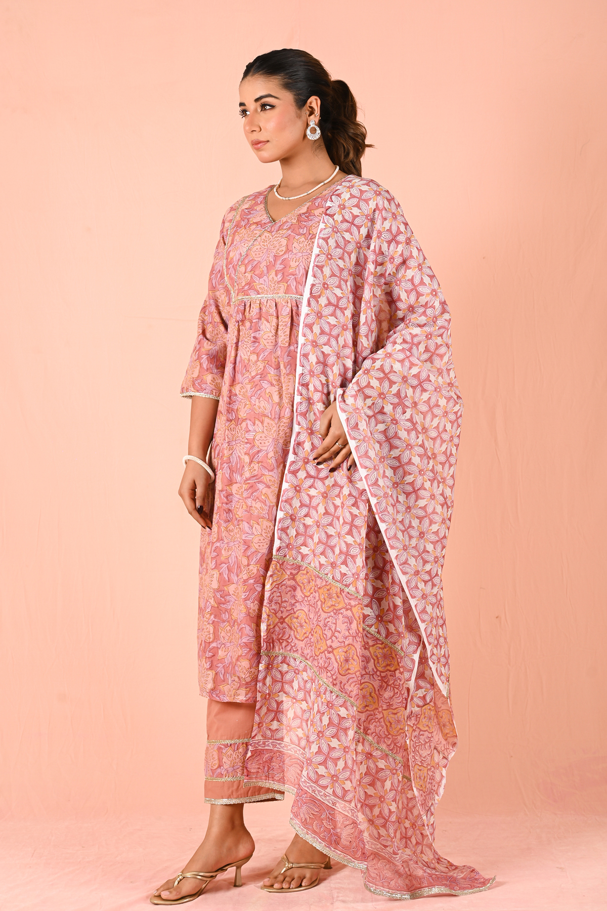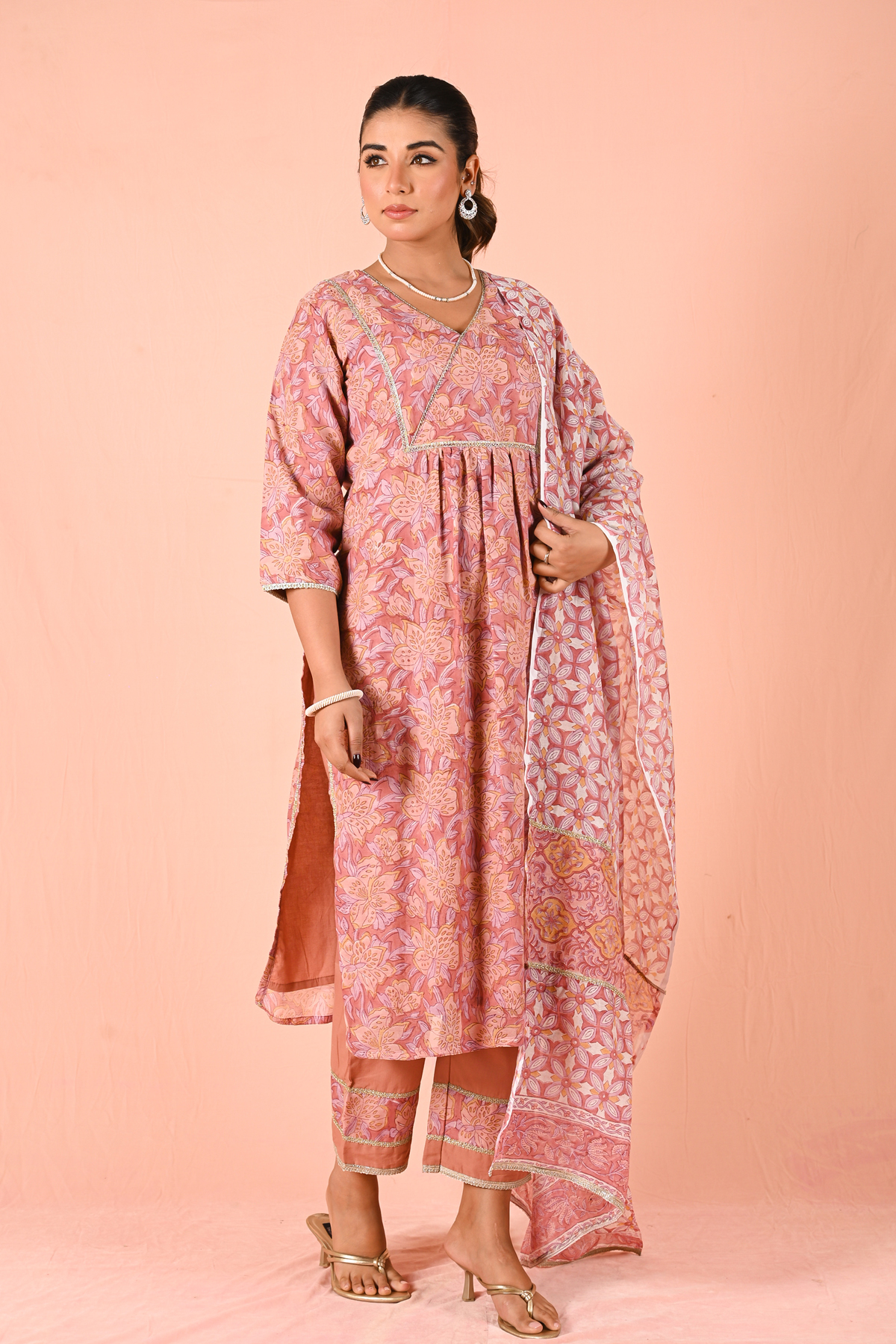 The ensemble is paired with a super-fine Mul Chanderi dupatta, light in feel and elegant in fall. A soft cotton pant, detailed subtly with gota accents, completes the set—offering comfort without compromising on style.