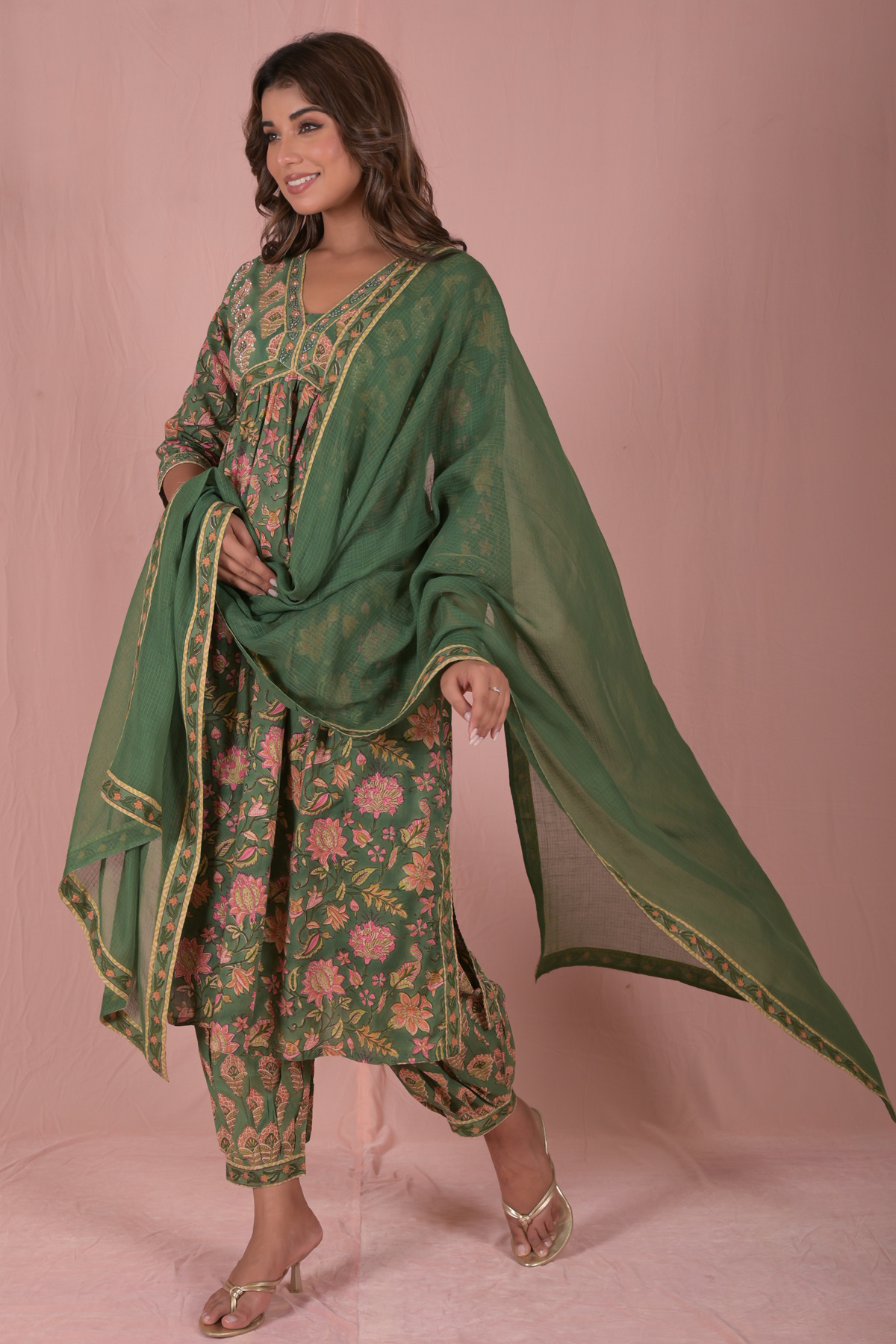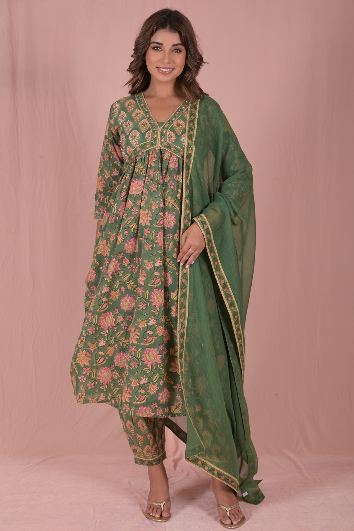 A sophisticated ensemble inspired by timeless Rangoon artistry. This kurta set comes in an elegant dark green base highlighted with delicate pink accents that bring a subtle charm. Crafted in soft, breathable cotton fabric, it ensures all-day comfort while maintaining a luxurious appeal. The fine print details and clean silhouette make it a must-have for any refined wardrobe.