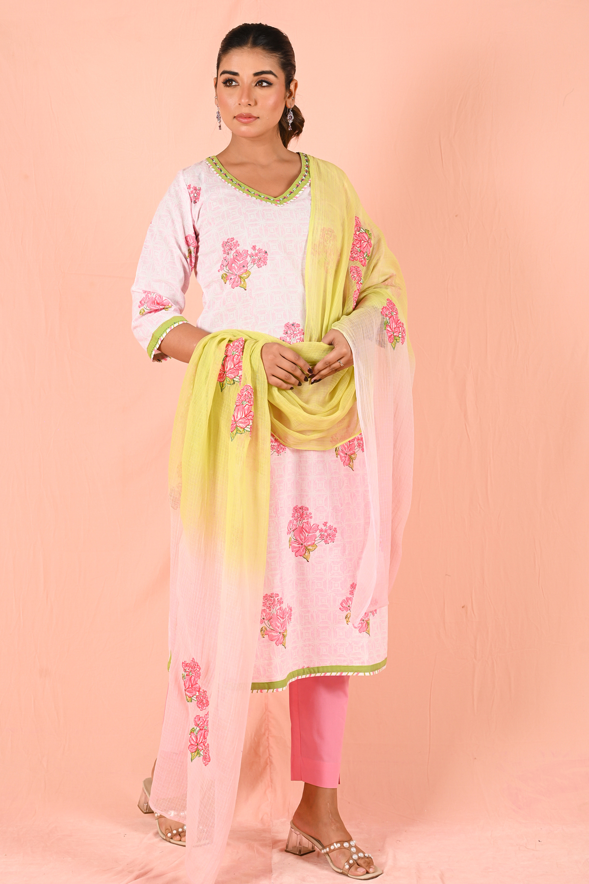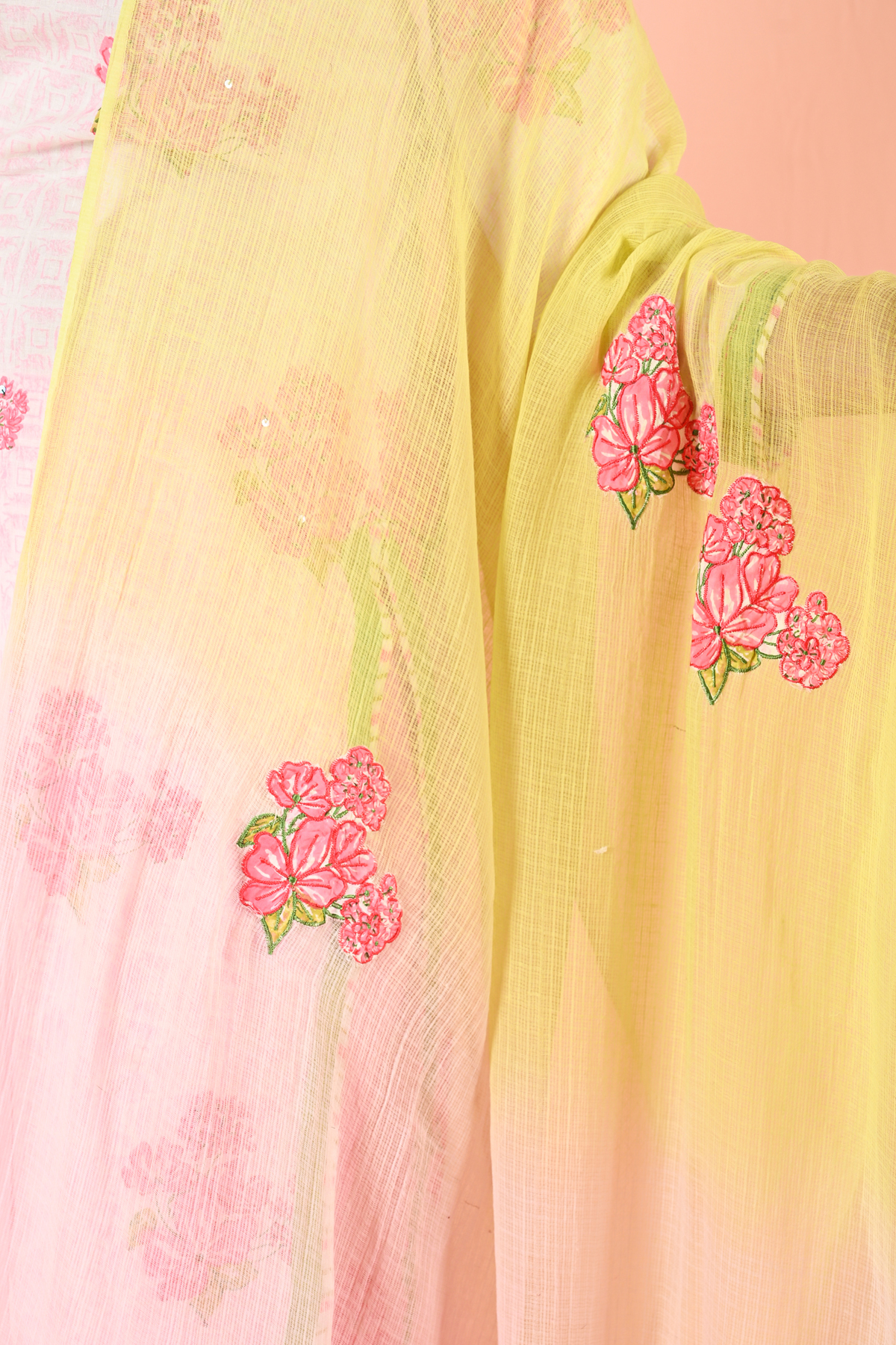 Paired with a beautifully Kota dupatta, this set stands out with its embroidered patchwork detailing and a graceful shaded effect, blending lemon hues into soft pink tones. The lightweight texture of the dupatta flows effortlessly, making it perfect for summer styling.
